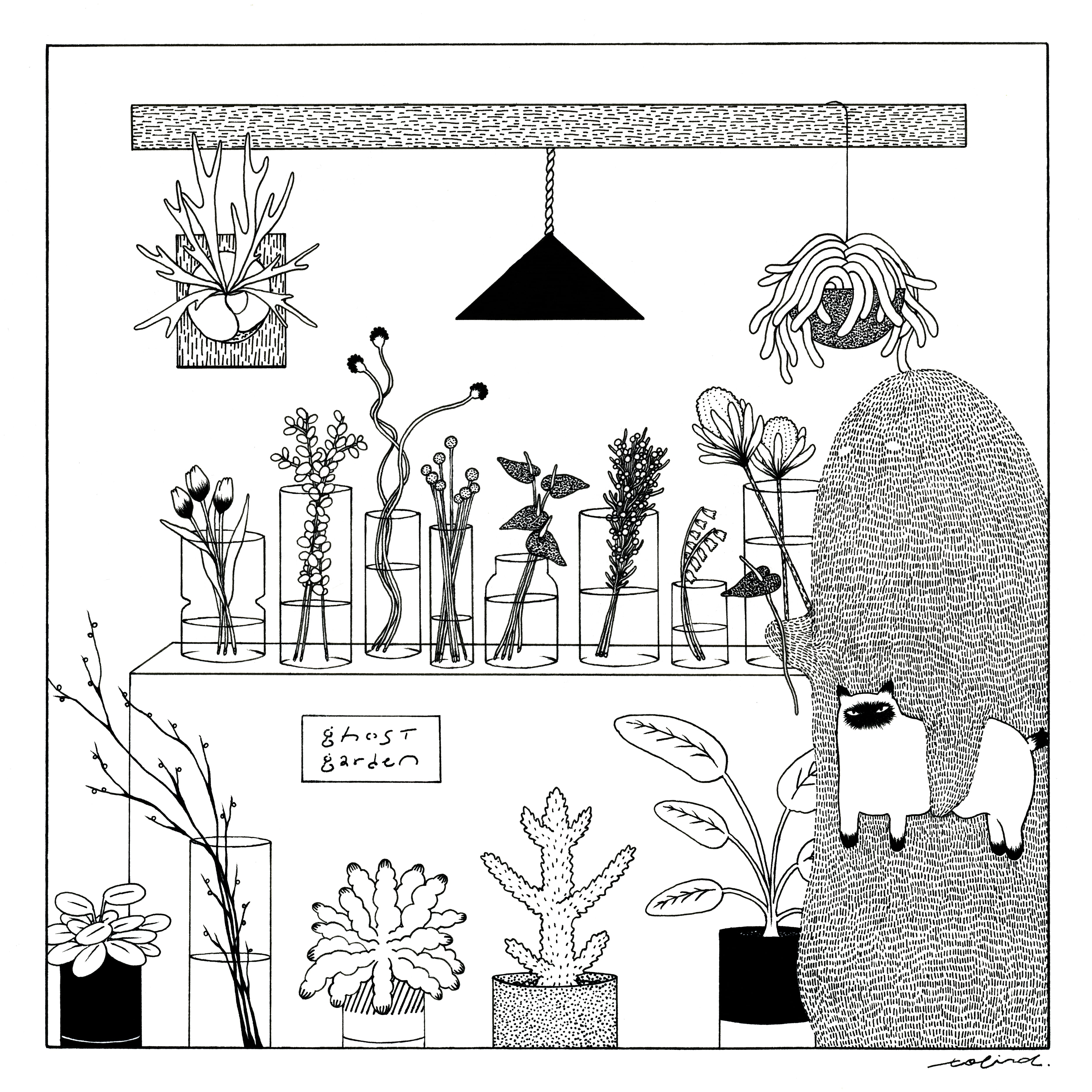 オバケの日常をテーマにしたイラストシリーズより"GHOSTGARDEN"という花屋をモチーフにした作品をフロントにプリントした半袖のTシャツです。