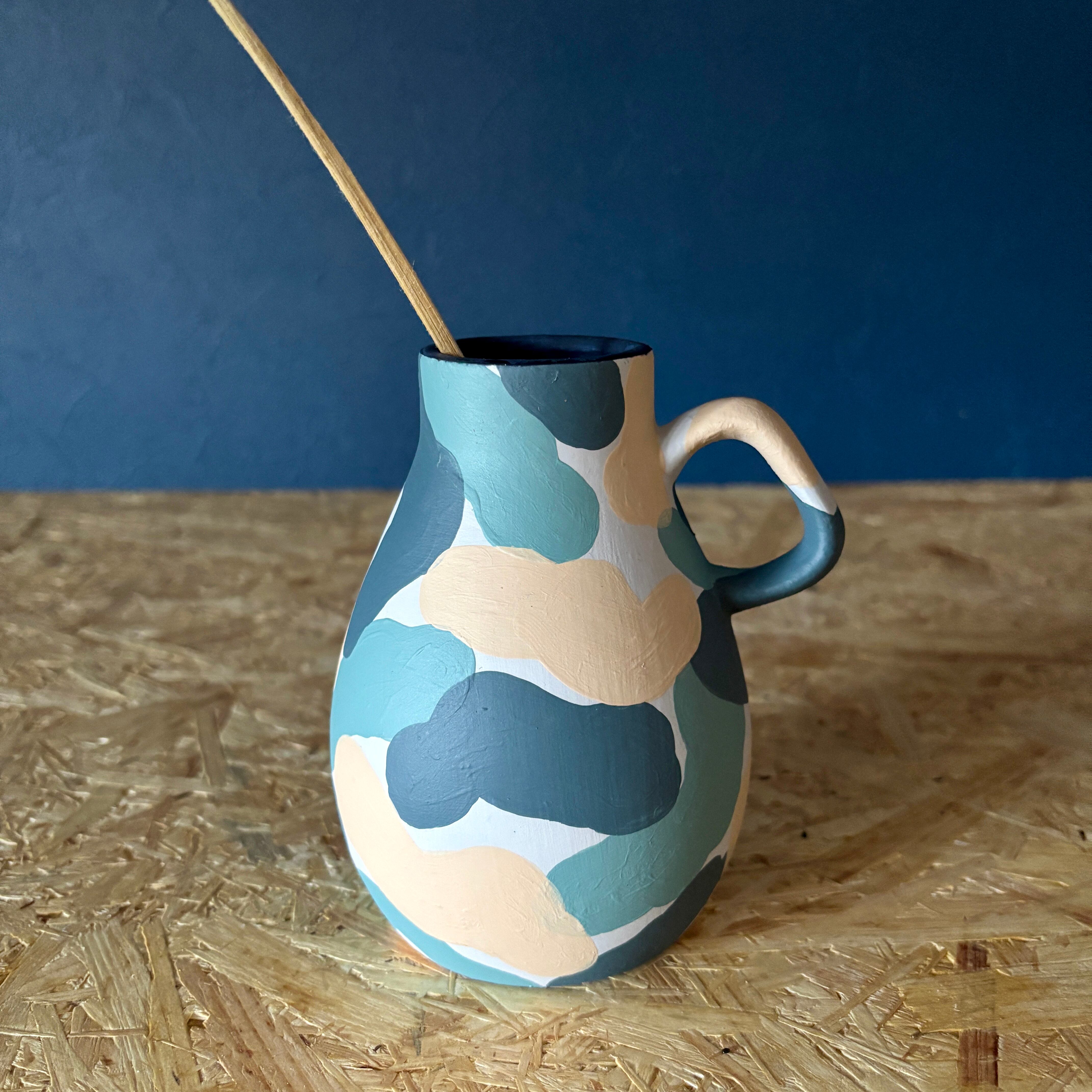 ひとつひとつ陶器やガラス素材の器にアクリル樹脂でペイントし、シリコンコーティングで防水加工を施した花器作品"Painting Vase"です。