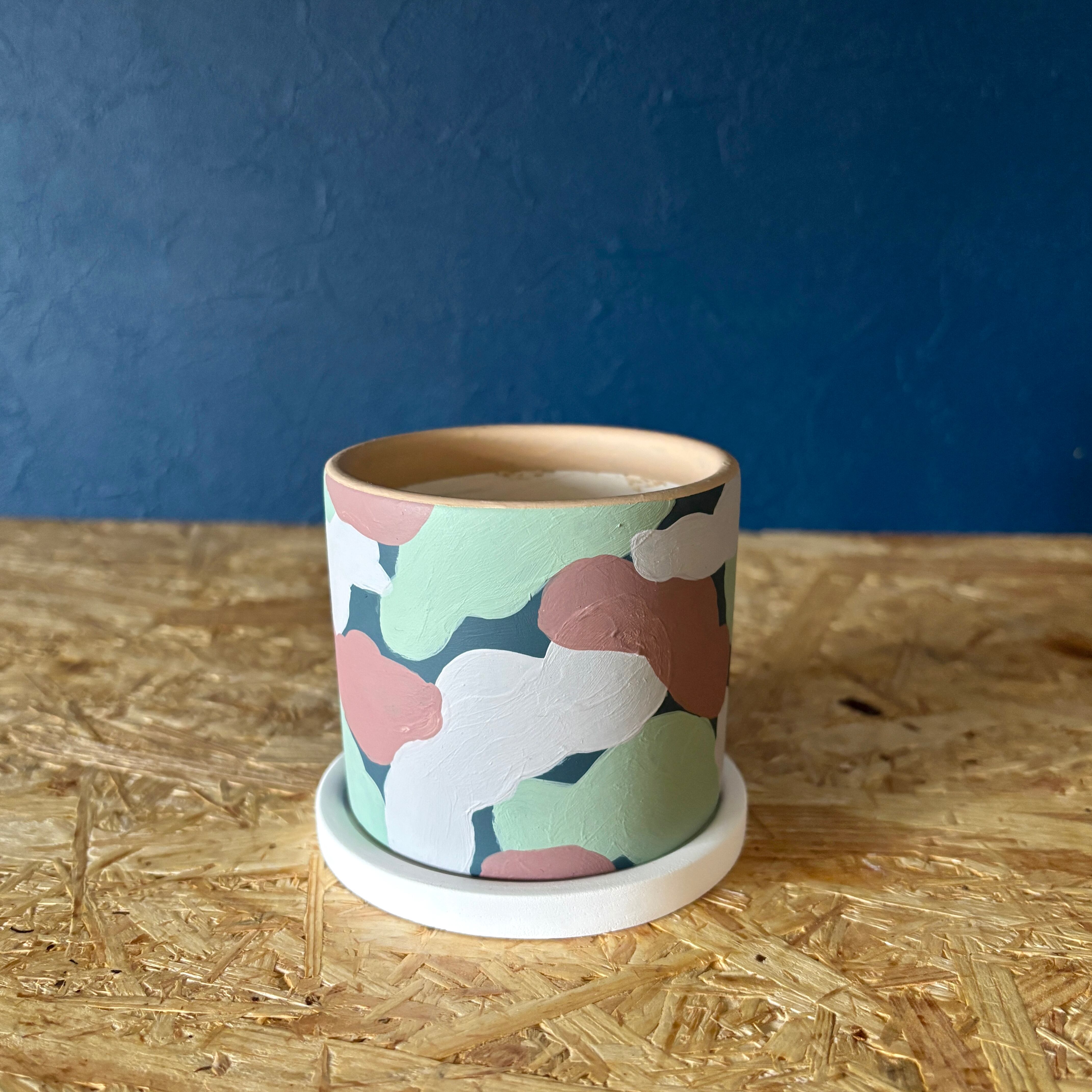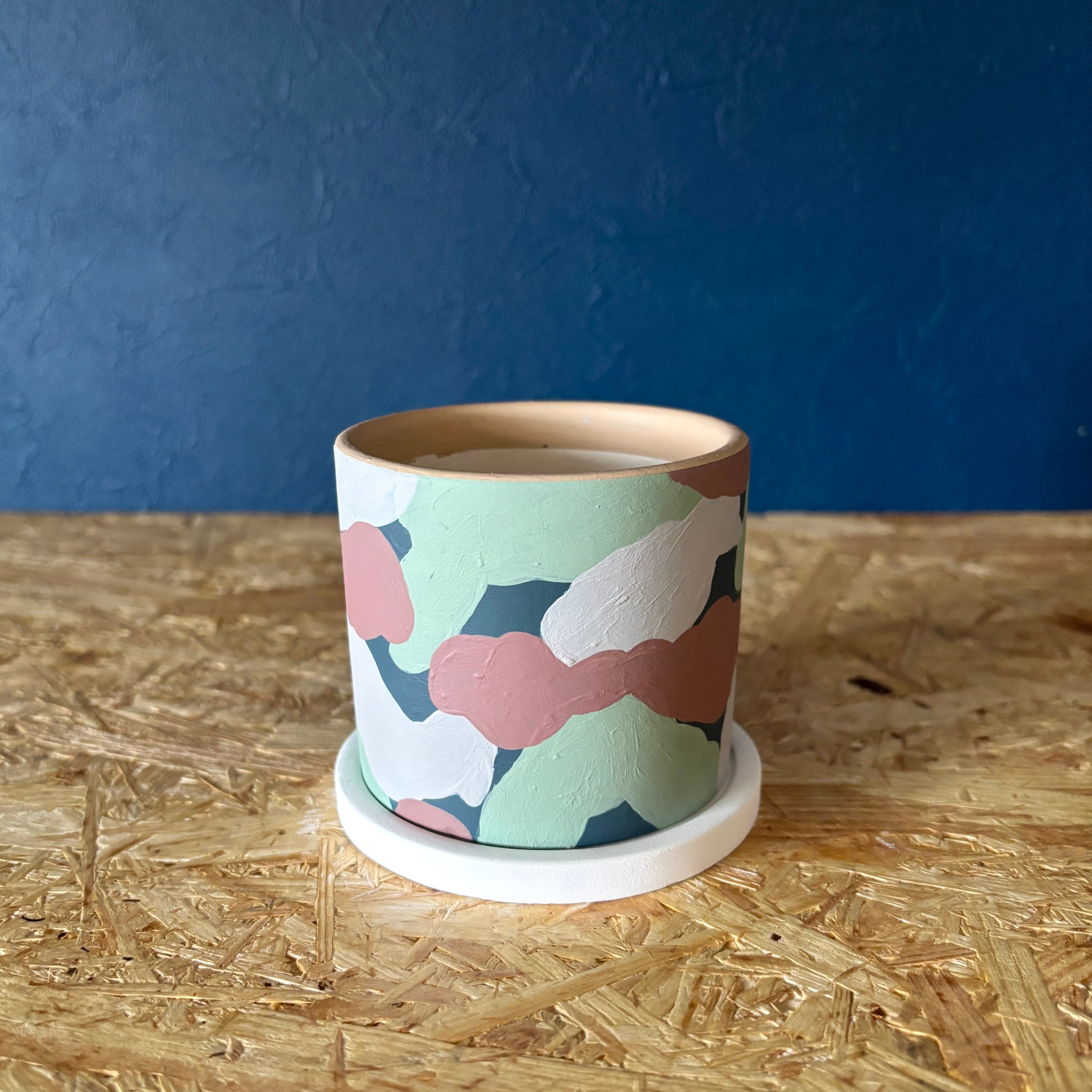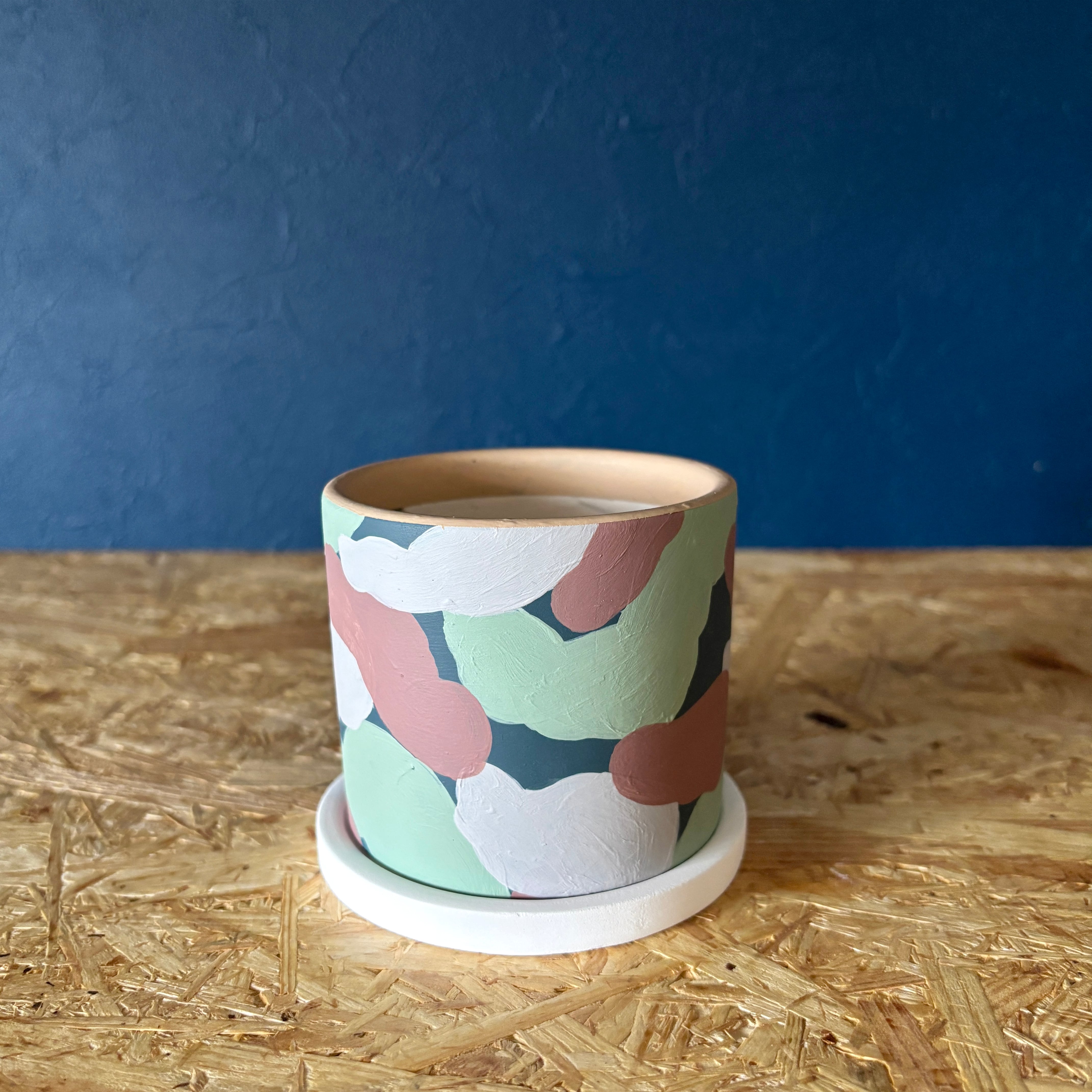 ひとつひとつ陶器やガラス素材の器にアクリル樹脂でペイントし、シリコンコーティングで防水加工を施した植木鉢作品"Painting Pot"です。