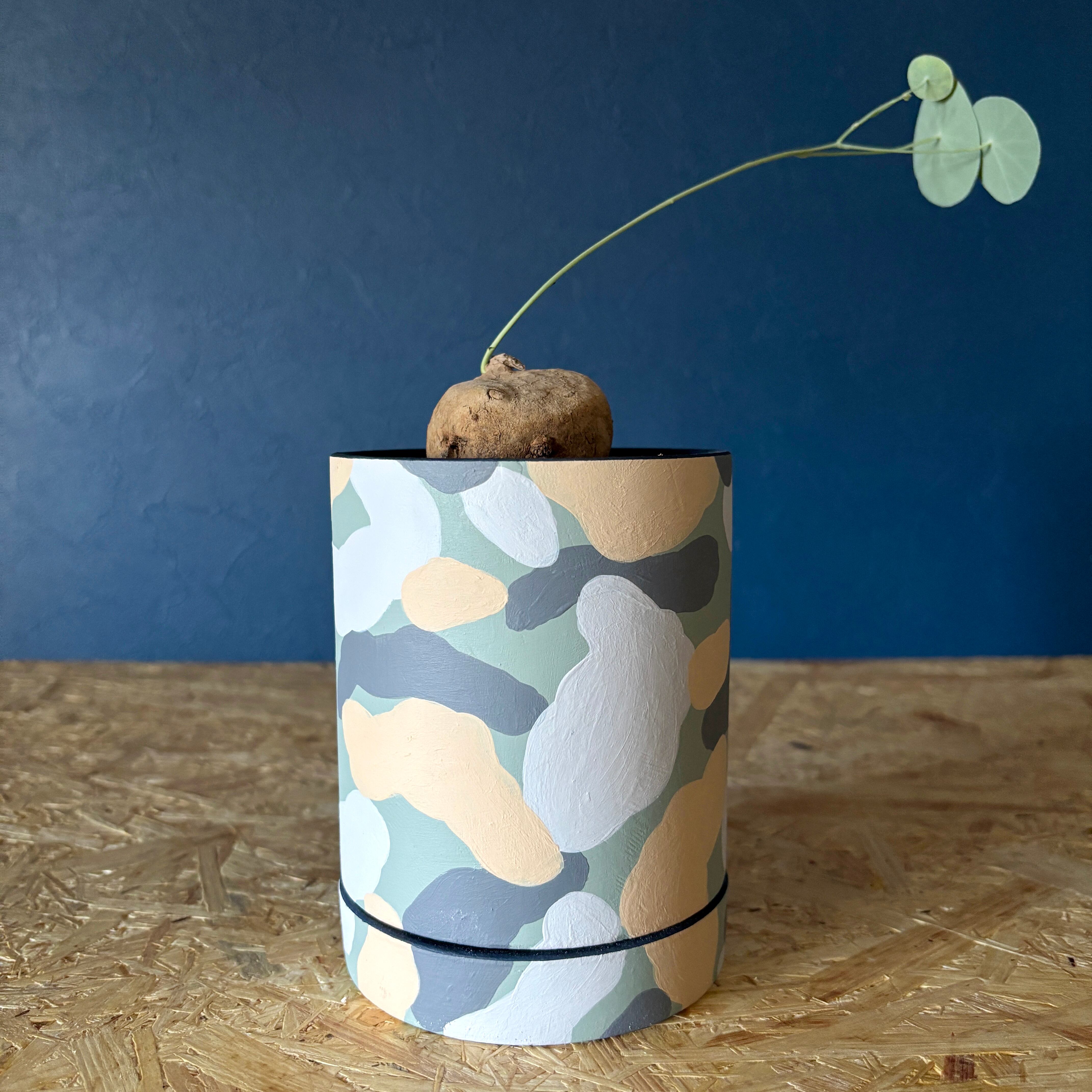 ひとつひとつ陶器やガラス素材の器にアクリル樹脂でペイントし、シリコンコーティングで防水加工を施した植木鉢作品"Painting Pot"です。