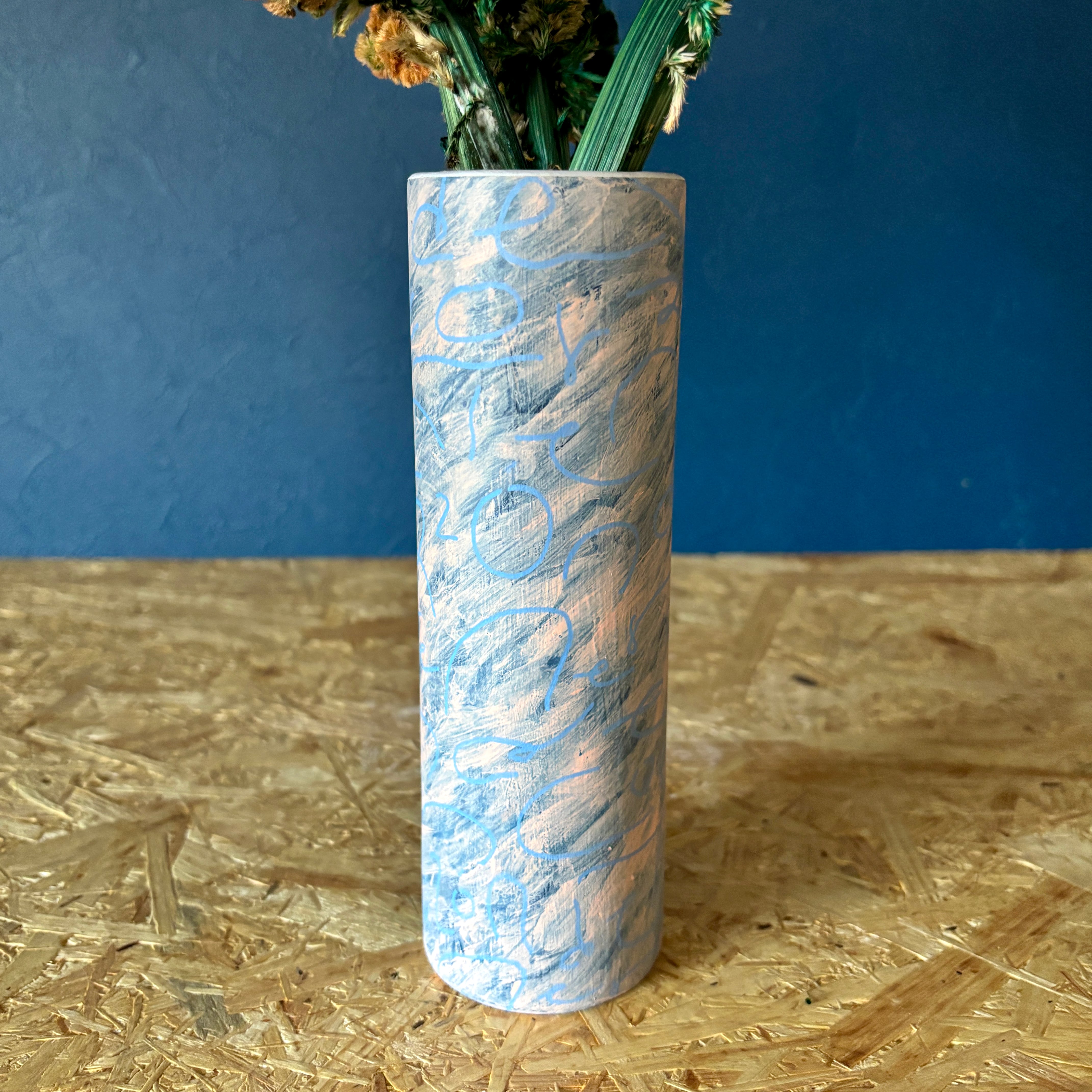 観葉植物の青さをより引き立たせ、生花の鮮やかを殺さないバランスのカラートーンの配色を選出し、やがて生花が褪色しドライフラワーへと変化した時には、逆にペインティングのカラーリングが際立ってコントラストが逆転し、インテリアとしても美しく成立します。
