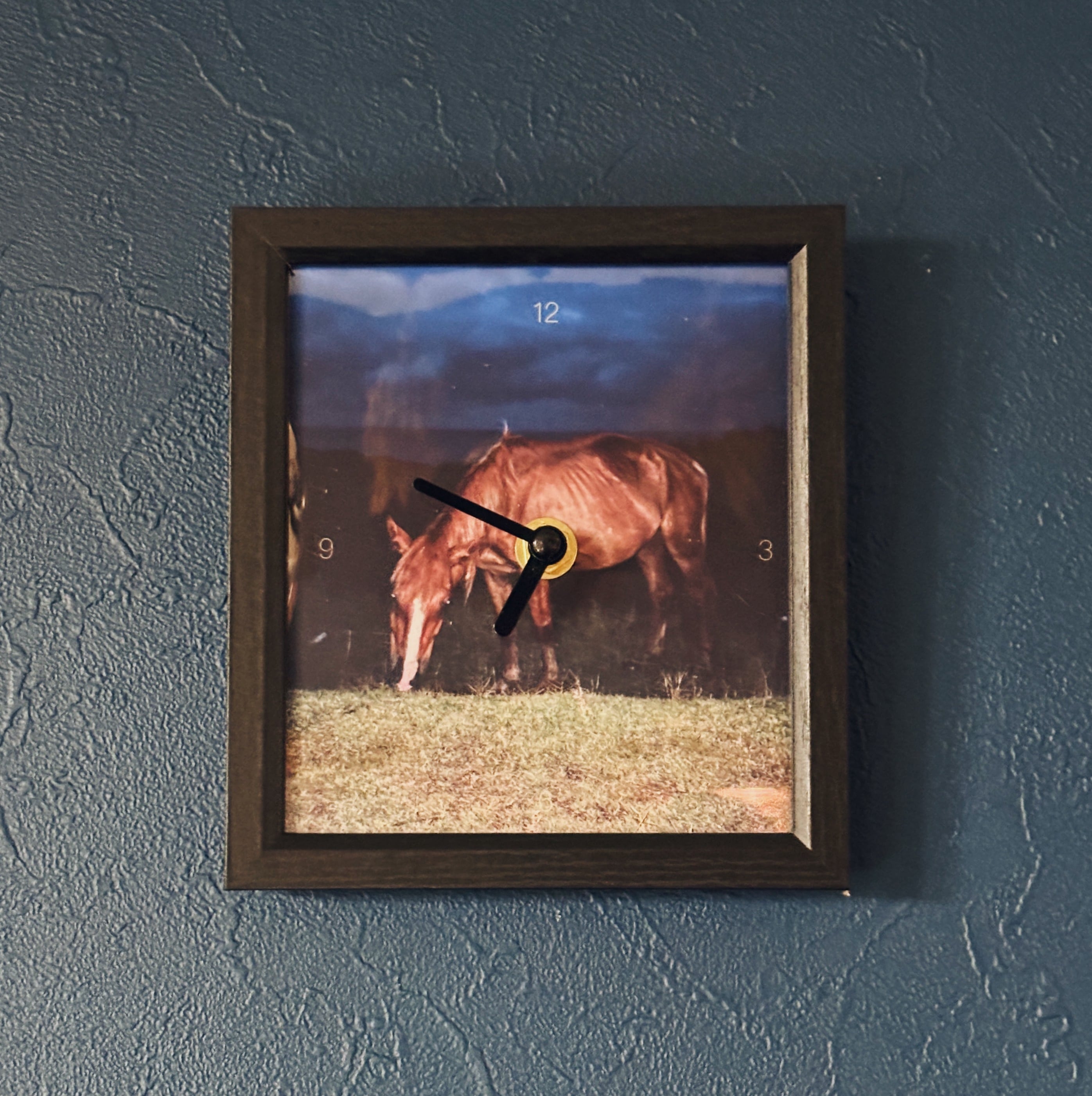 旅で出会った馬達をmoring / evening / midnight の3つの異なる時間で捉えた写真のうち、こちらはmidnight 真夜中の海辺に佇む馬の写真。35mmフィルムで撮影した作品をスキャニングしてのちプリントし、フレーミングした掛け時計。
