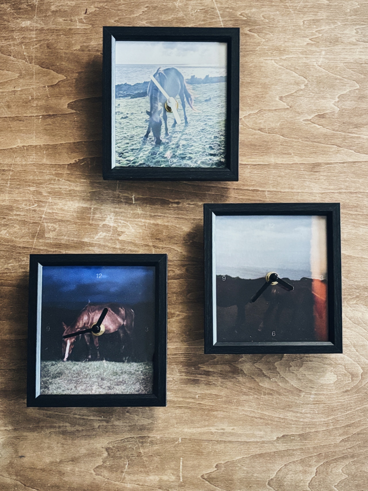 旅で出会った馬達をmoring / evening / midnight の3つの異なる時間で捉えた写真のうち、こちらはmorning 海辺で朝の光に照らされた馬をプリントし、フレーミングした掛け時計。