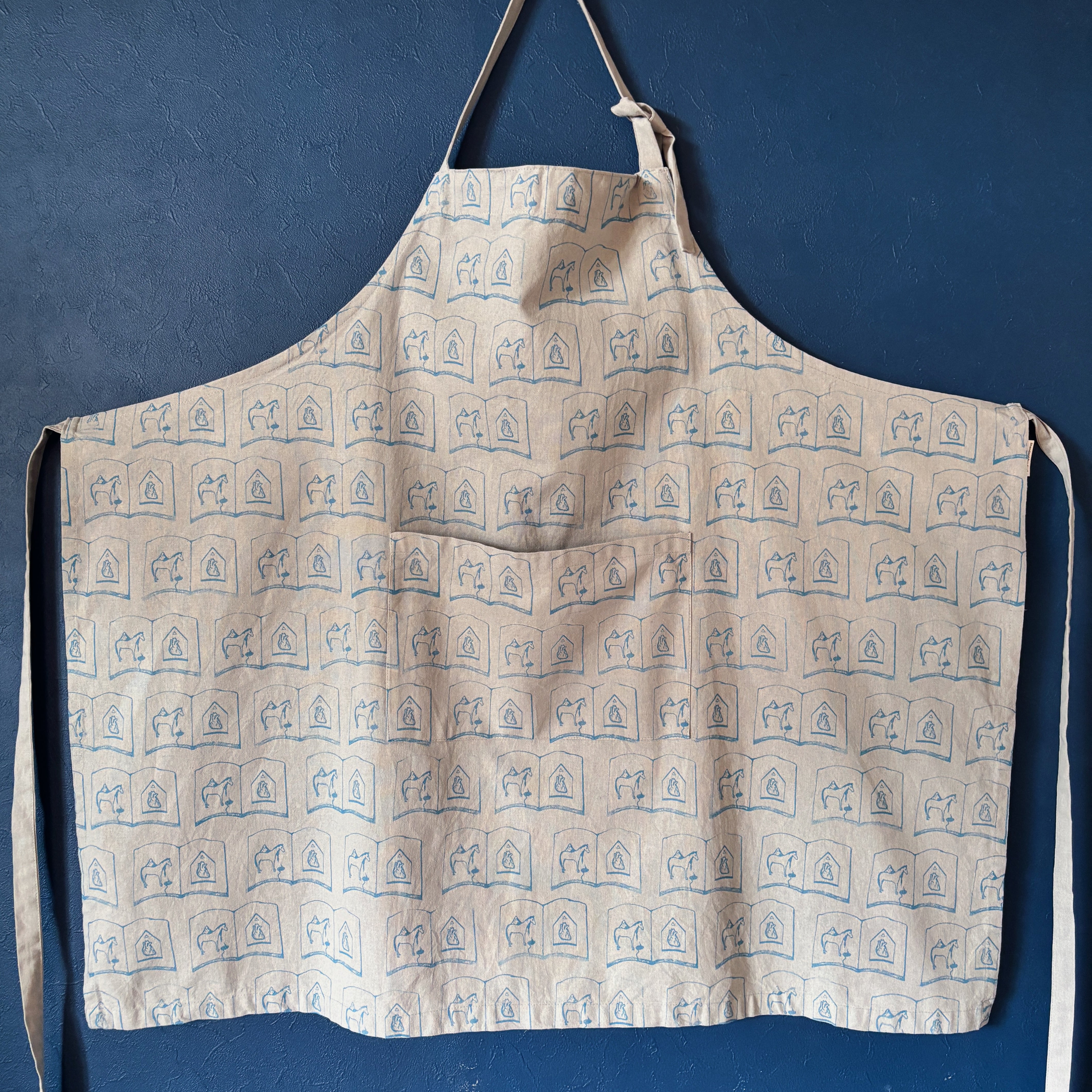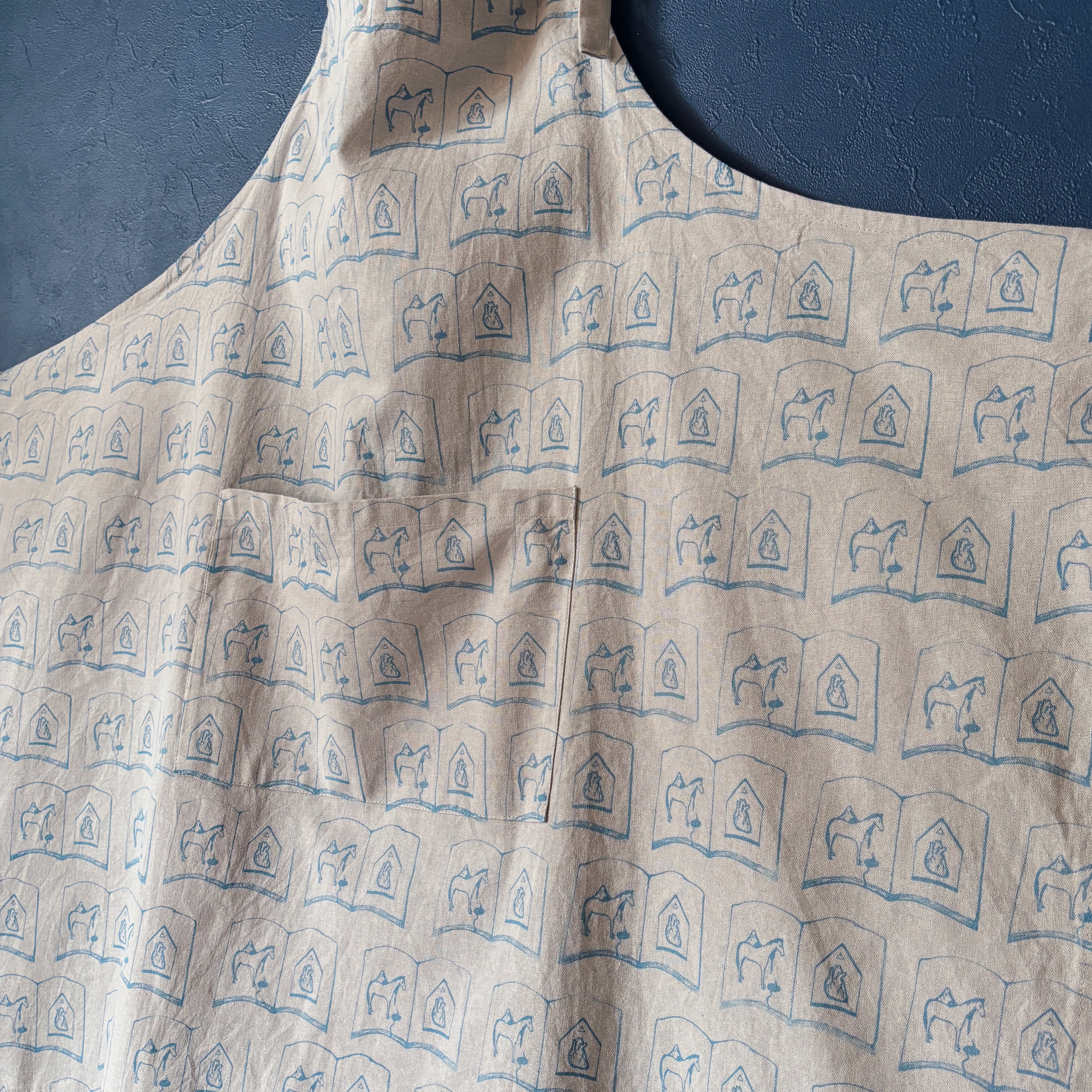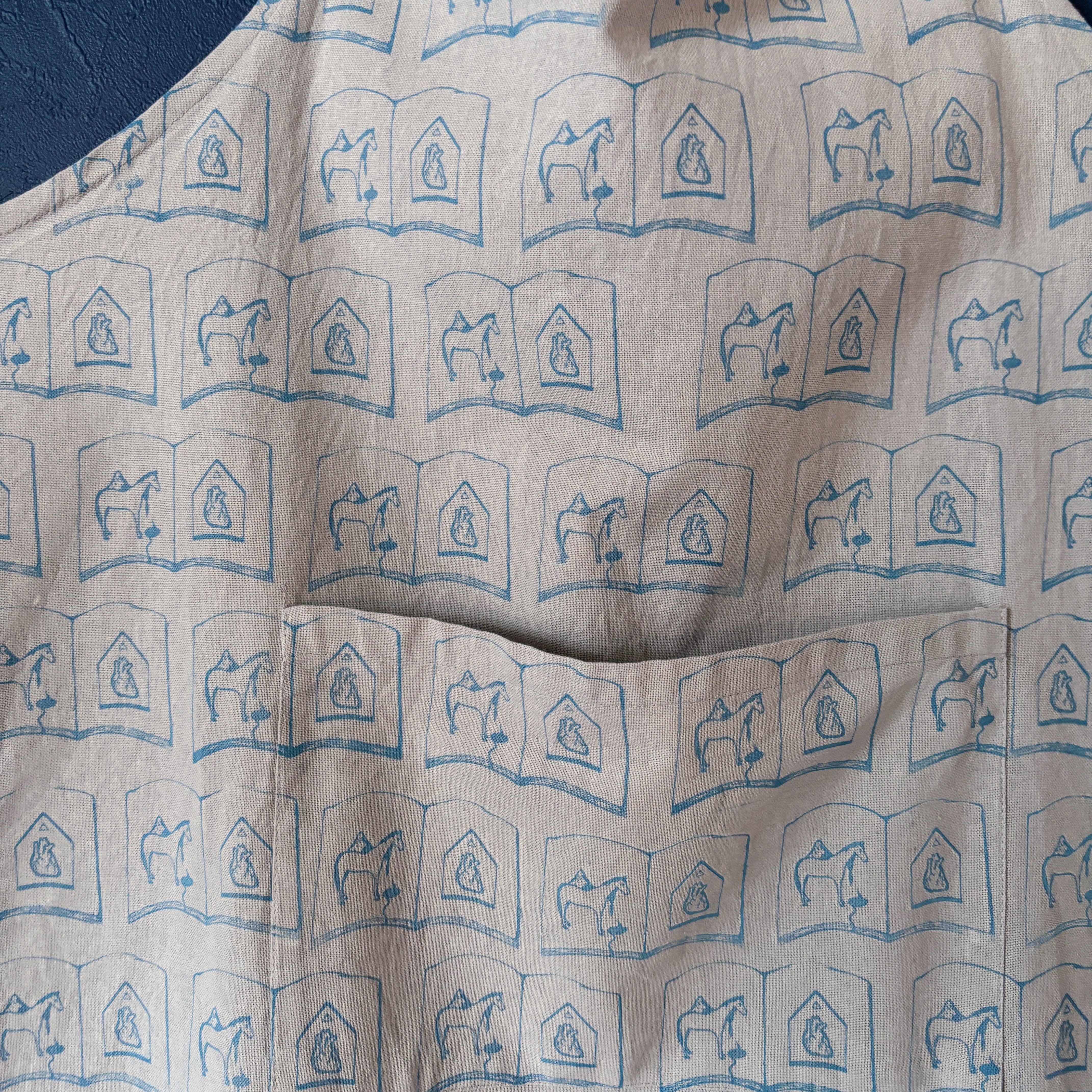 ドローイングイラストをスタンプに起こし、顔料インクで直接生地に押印したパターンエプロン。こちらはtobirdのメインロゴでもある"馬と心臓の本"のモチーフ柄。