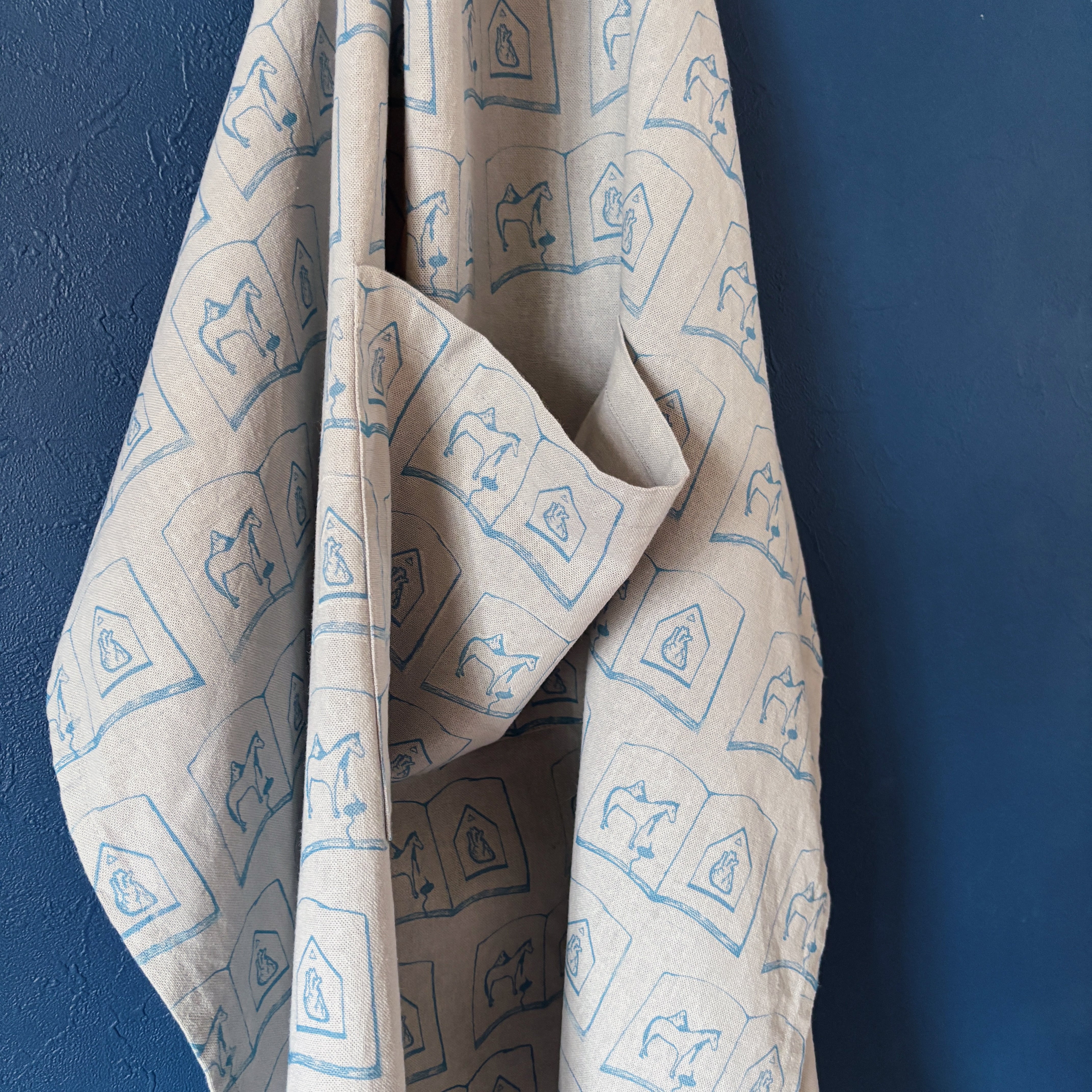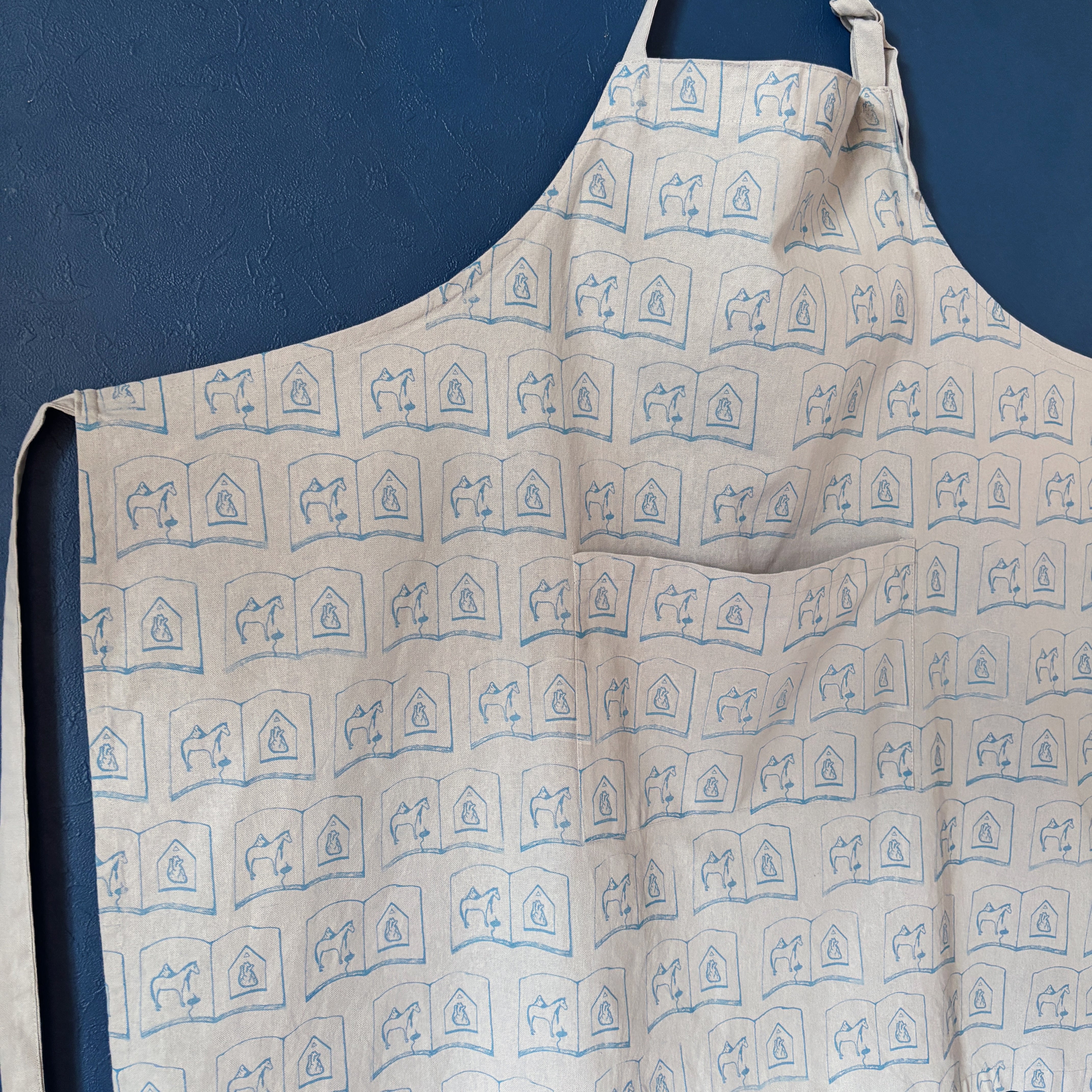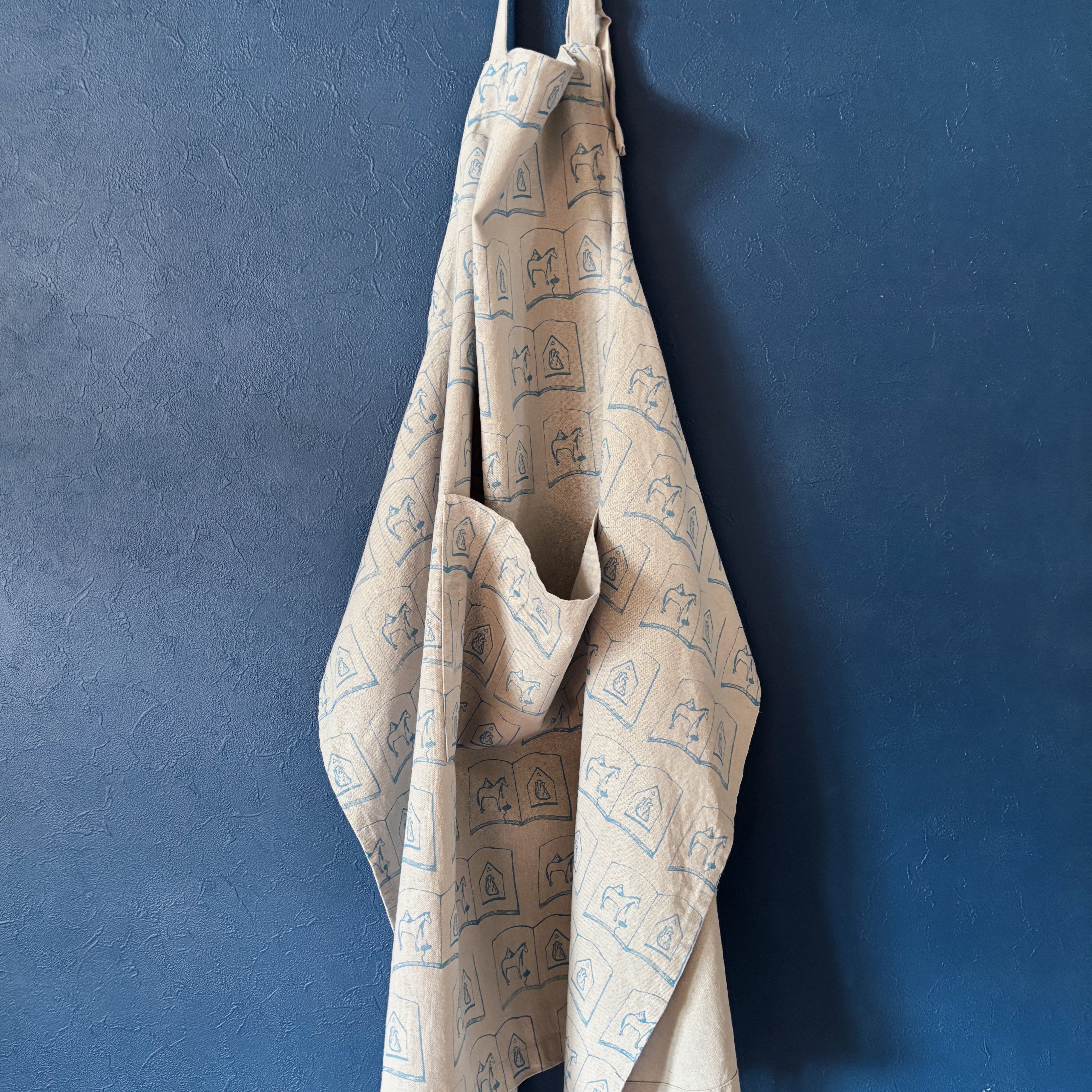 ドローイングイラストをスタンプに起こし、顔料インクで直接生地に押印したパターンエプロン。こちらはtobirdのメインロゴでもある"馬と心臓の本"のモチーフ柄。