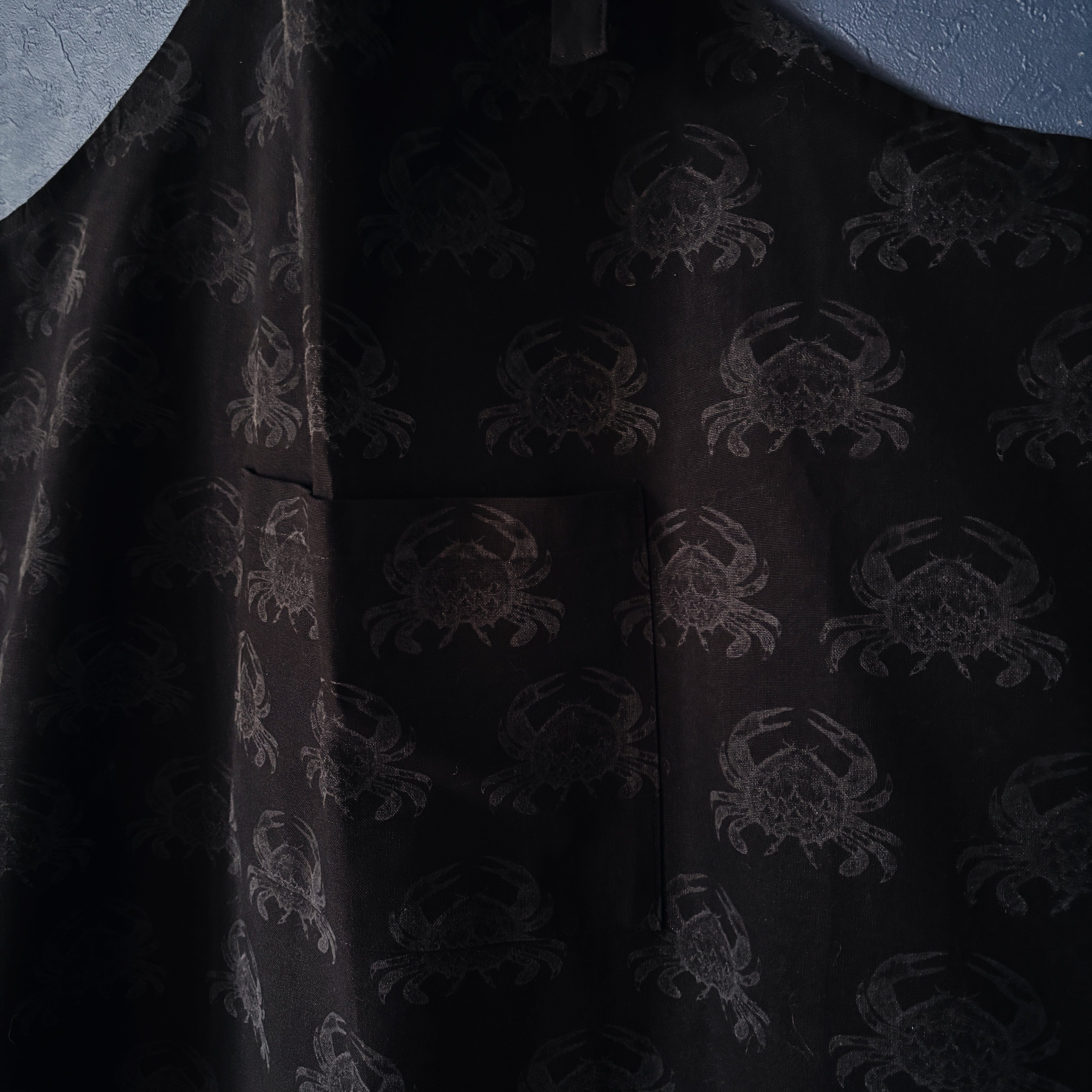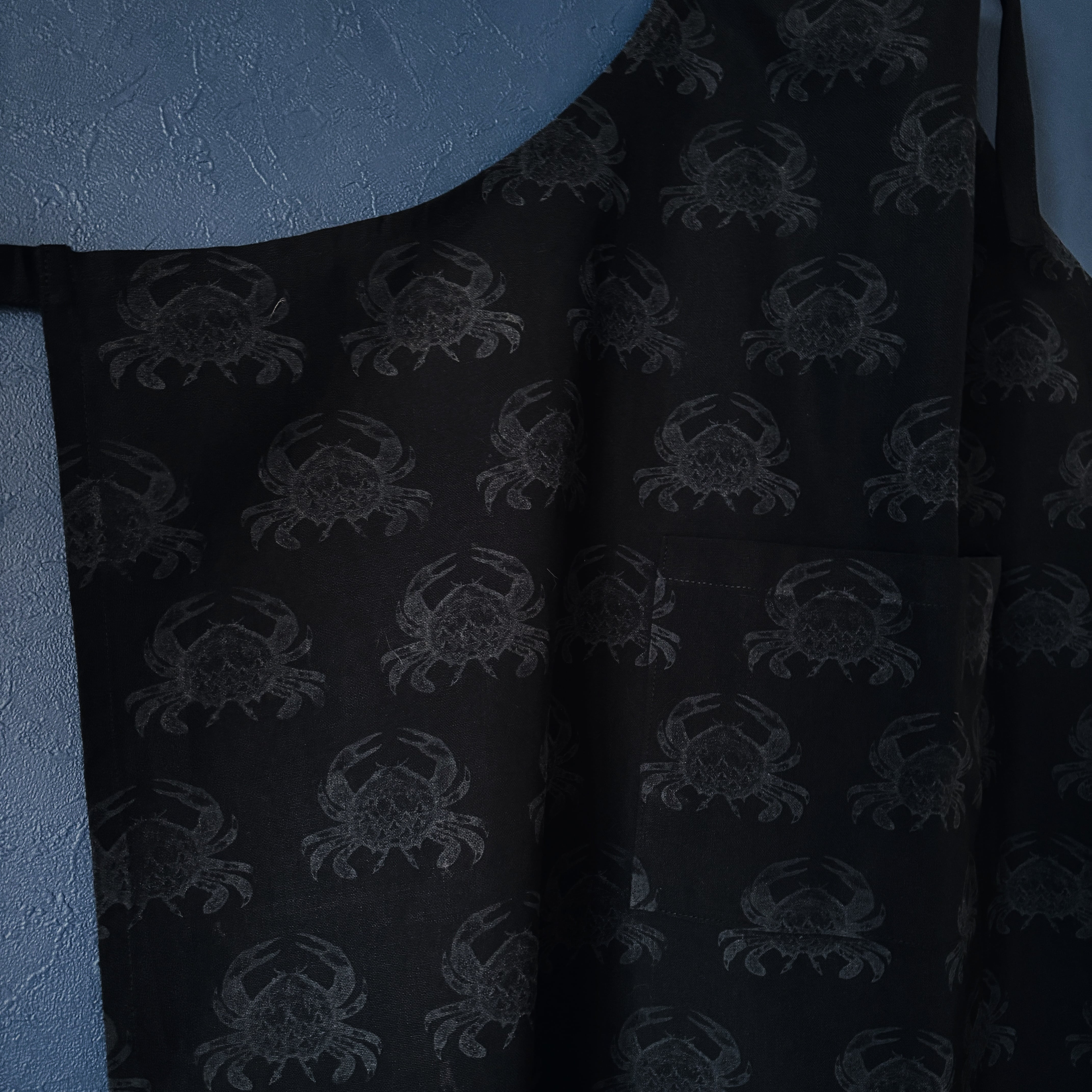 ドローイングイラストをスタンプに起こし、顔料インクで直接生地に押印したパターンエプロン。こちらは背中に山を背負った蟹のモチーフ柄。